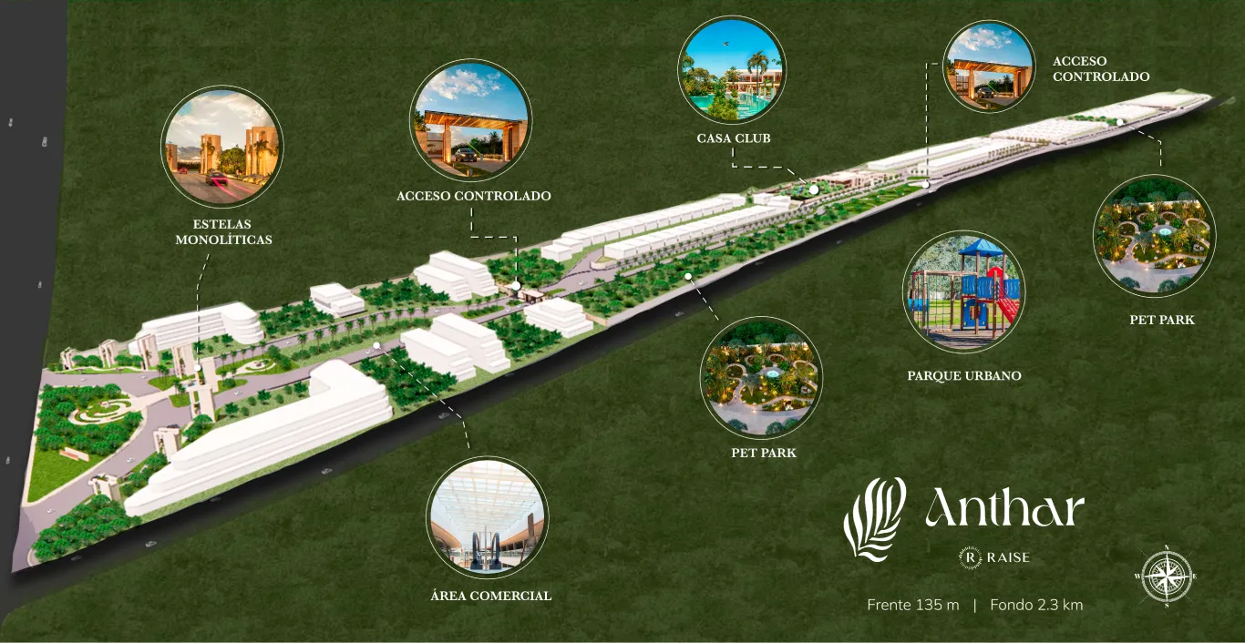 Anthar cuenta con 31 hectáreas y 422 lotes residenciales, diseñado para ofrecer un balance entre privacidad, comodidad y accesibilidad. Su ubicación a pie de carretera te permite estar conectado de manera ágil con puntos clave de la región, mientras disfrutas de un ambiente de paz y amplitud.